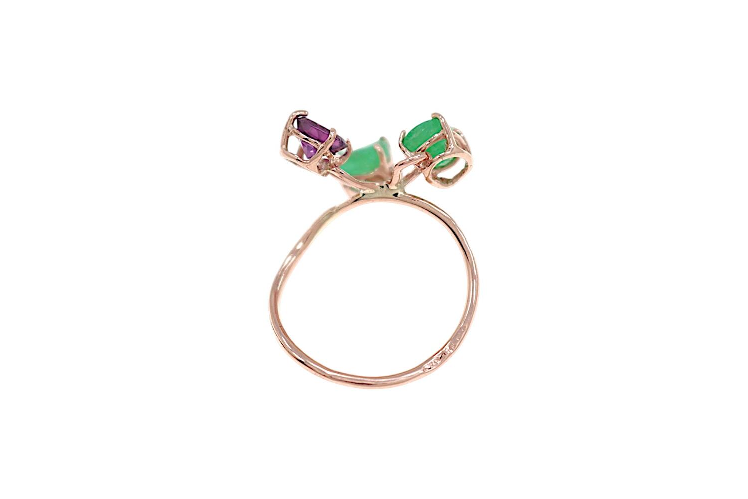 Anello realizzato a mano in oro rosa 9k con 2 smeraldi ovali taglio brillante per totale ct. 1.15 e una ametista tonda taglio brillante di ct. 0.55